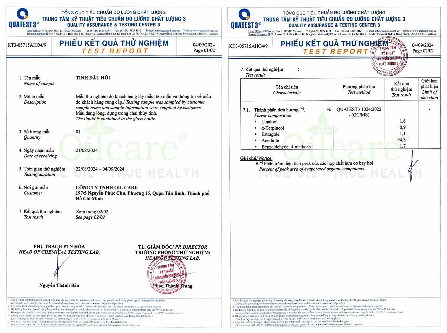 Xem bảng kiểm nghiệm thành phần của tinh dầu hồi do QUATEST 3 (Trung tâm Kỹ thuật Tiêu chuẩn Đo lường Chất lượng 3)