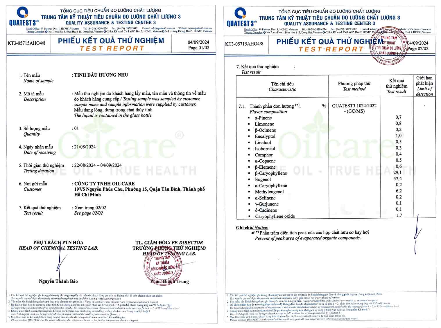 Xem bảng kiểm nghiệm thành phần của tinh dầu hương nhu do QUATEST 3 (Trung tâm Kỹ thuật Tiêu chuẩn Đo lường Chất lượng 3)