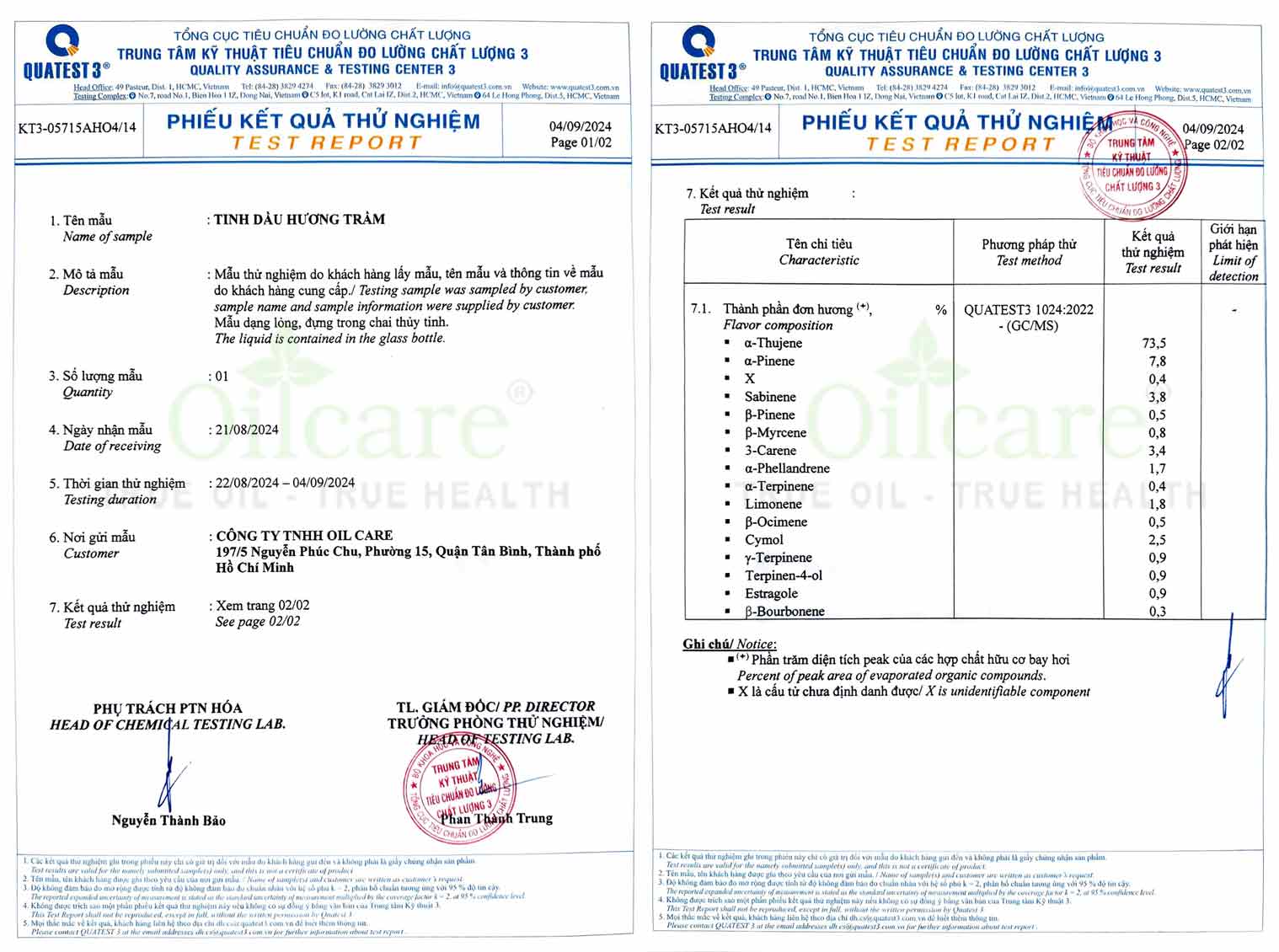 Xem bảng kiểm nghiệm thành phần của tinh dầu hương trầm do QUATEST 3 (Trung tâm Kỹ thuật Tiêu chuẩn Đo lường Chất lượng 3)